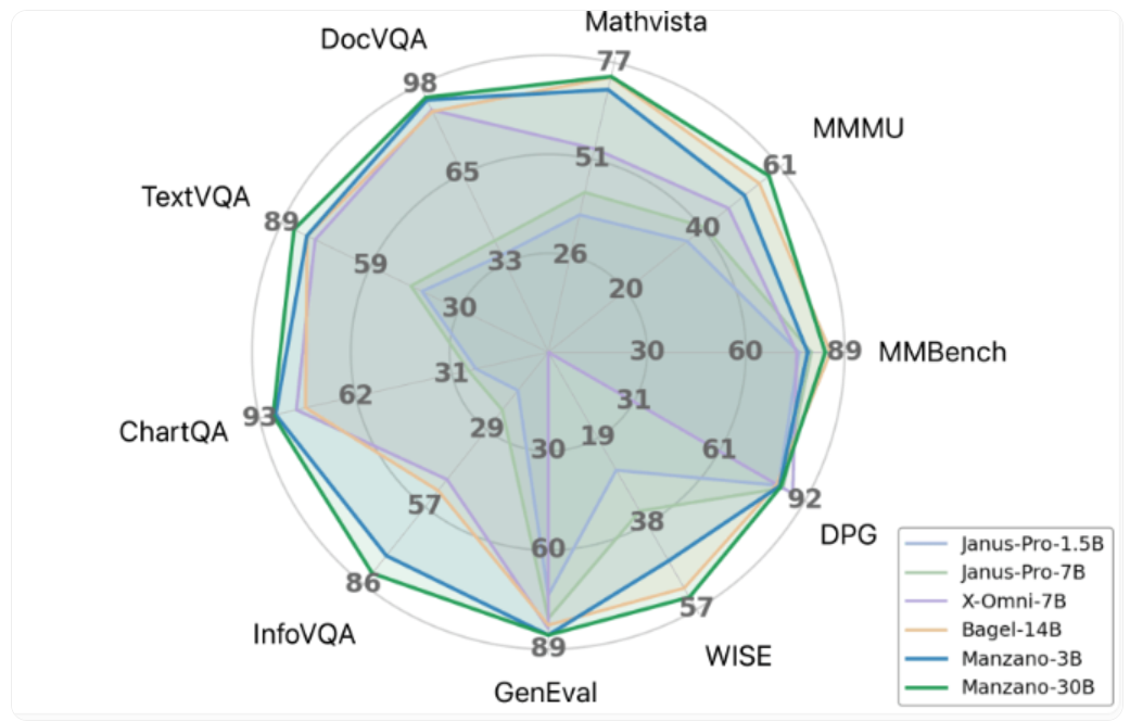 苹果的测试结果显示,Manzano 在多个基准测试中表现优异,特别是在处理文本密集型任务如图表和文件分析方面,30亿参数版本的得分尤为突出。研究还发现,随着模型参数量从3亿到30亿增加,性能持续改善。