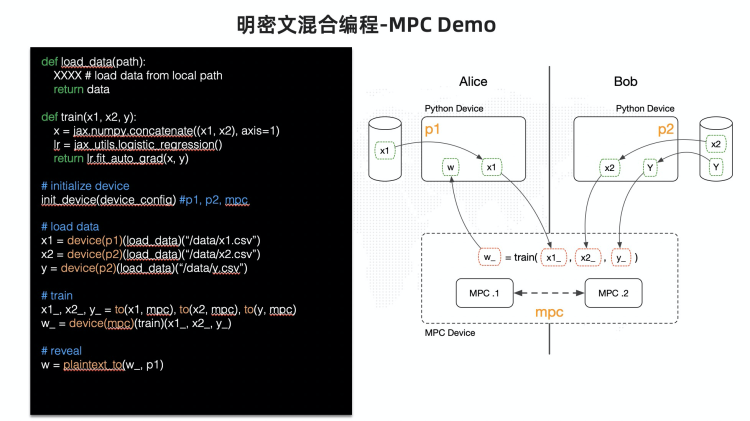 隐语提供了非常自由的明密文混合编程范式,我们不限制明文的引擎,也不限制密文引擎,开发者可以用他自己熟悉的框架开发,然后标记其中的某一部分用明文引擎跑,另一部分用SPU跑。