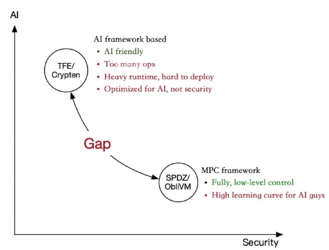 无论是基于AI框架(TFE/CrypTen),还是从安全计算出发的框架(SPDZ),都有自己的问题。前者往往难部署,难做安全领域特定的优化。后者往往会需要写一些Toy AI框架,学习成本高。
