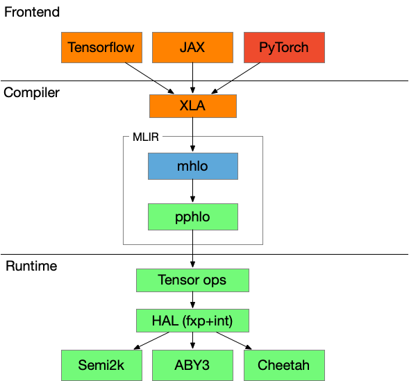 我们可以将SPU理解成一个带安全语义的Backend,对接XLA的理由是Tensorflow/Jax/PyTorch计算图最终都可以翻译到XLA IR,只要SPU可以解释和执行XLA IR,理论上就可以原生支持多种AI前端。