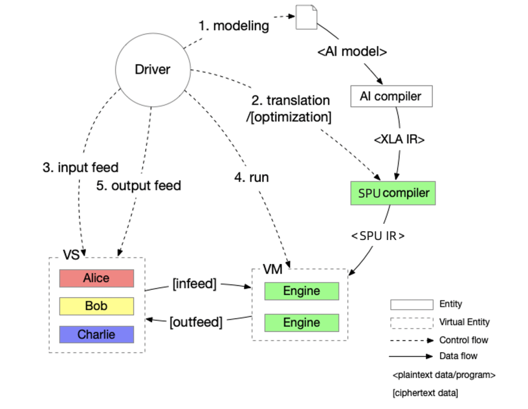 最终,通过编译时和运行时的层层翻译,SPU将AI前端和MPC后端解耦,使得在SPU中扩展的任何安全协议都可以无感的支持多种前端。