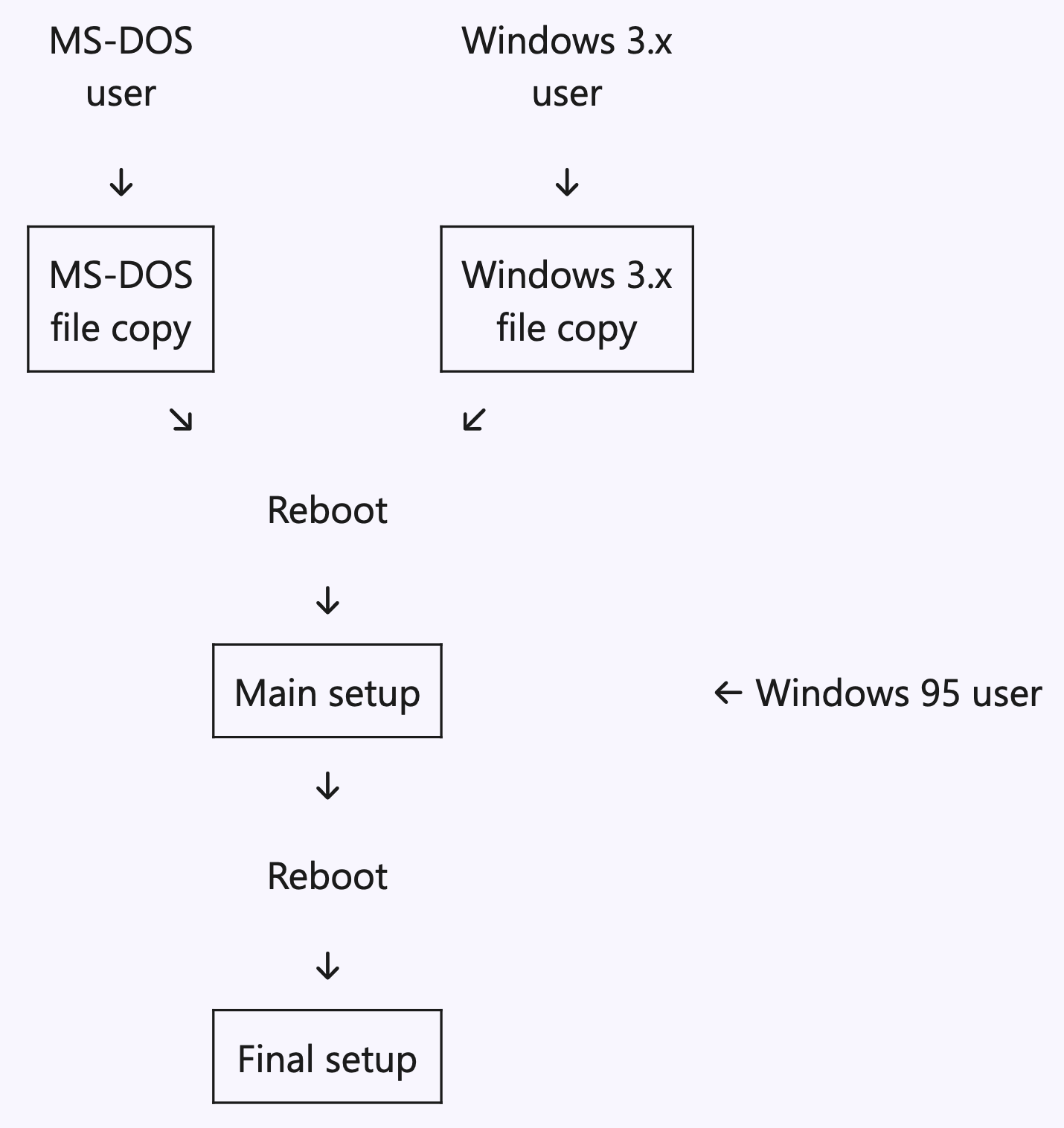 数月前,Chen曾介绍,Windows 95安装的第一步是通过一个DOS程序,先装上“迷你版”Windows 3.1,为后续流程做准备。第二阶段则由一个16位Windows程序接管,完成大部分安装工作。这一16位程序既用于从Windows 3.1环境安装Win95,也用于在已有Win95环境下重新安装操作系统。
