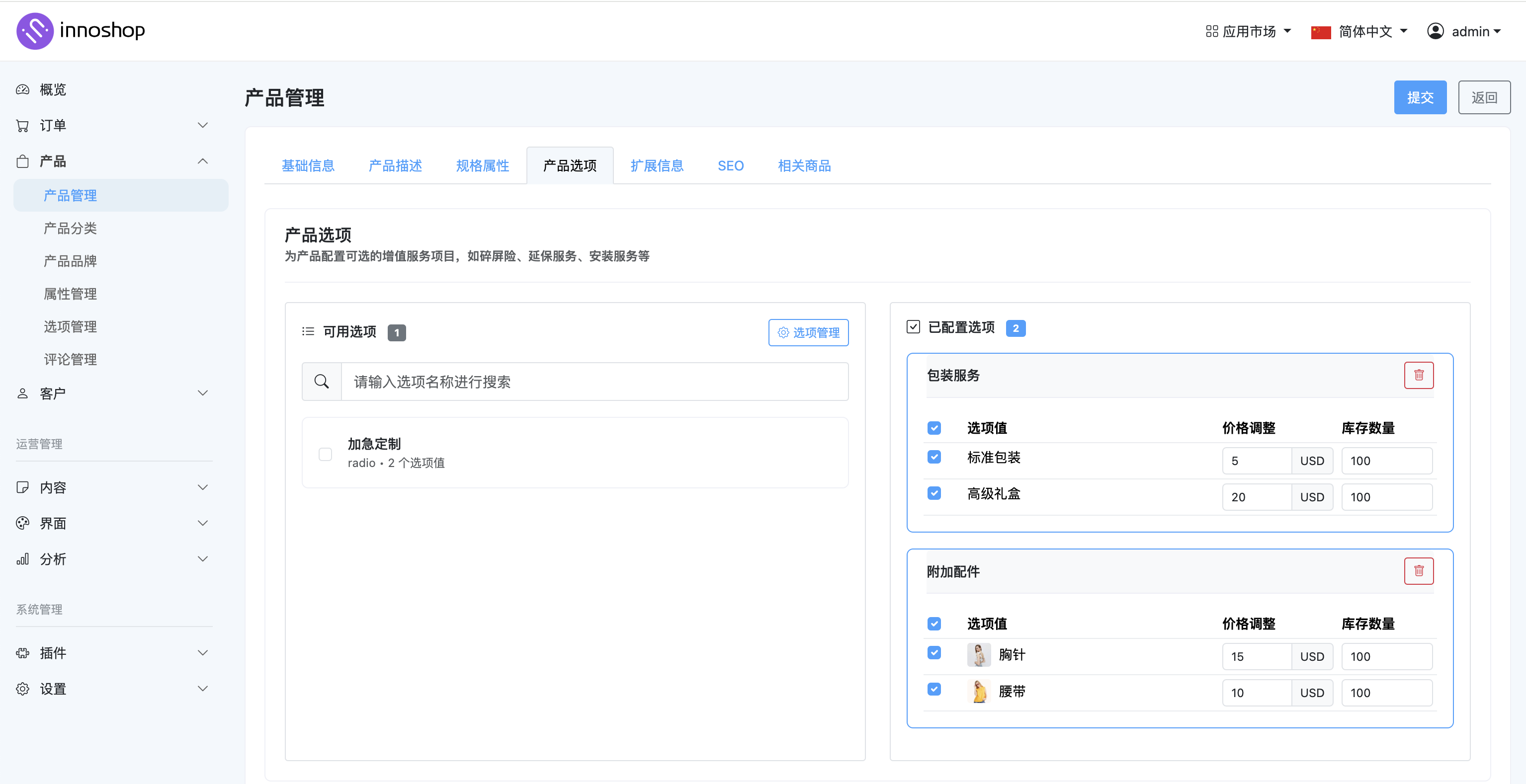产品选项系统:支持为产品添加增值服务选项,完整的选项管理与排序,多语言支持。