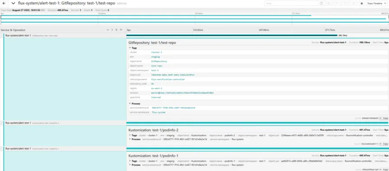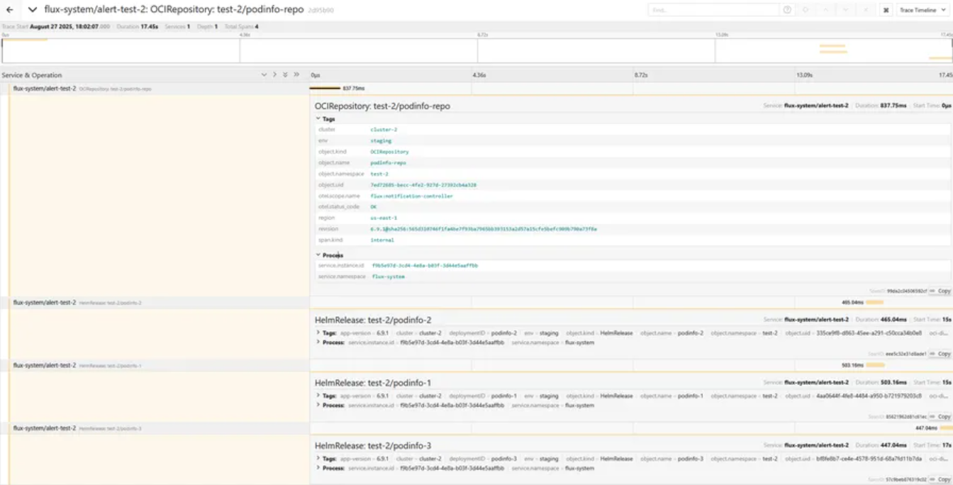 notification-controller 会将 Flux 事件转换为 OTEL span,并基于 Flux 对象层级建立正确的追踪关系。源对象(GitRepository、HelmChart、OCIRepository、Bucket)生成根 span,Kustomization 和 HelmRelease 生成子 span。每个 span 包含事件元数据,服务标识使用告警名称和命名空间。