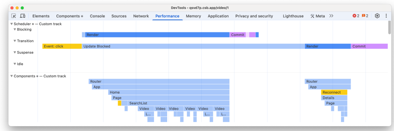 调度器跟踪显示 React 在不同优先级下正在做什么,例如“阻塞”用于用户交互,或“过渡”用于 startTransition 内的更新。在每个跟踪中,你会看到正在进行的工作类型,例如安排更新的事件,以及该更新的渲染发生的时间。
