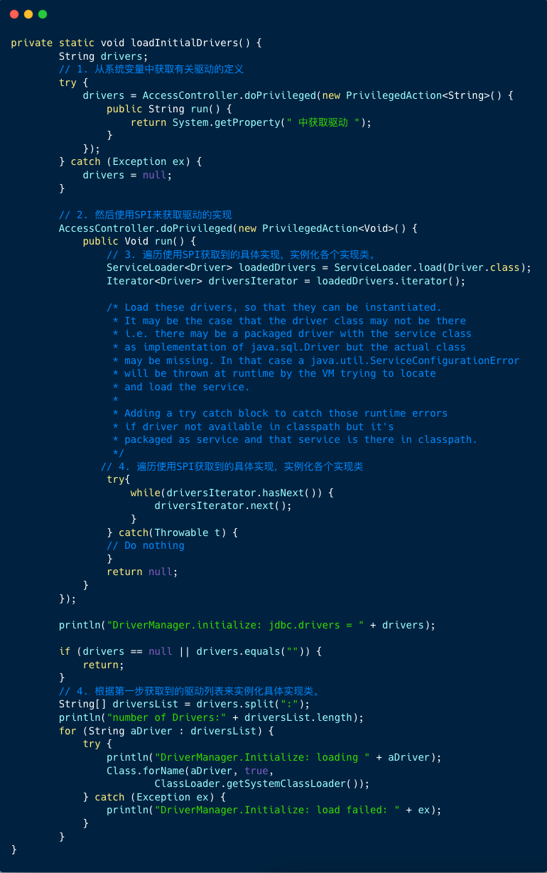 我们重点关注 SPI 的用法,首先看第二步,使用 SPI 来获取驱动的实现类 , 对应的代码是: