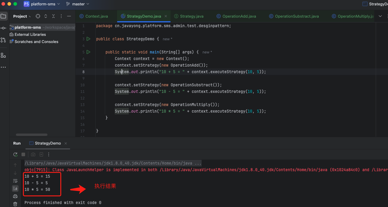 System.out.println("10 * 5 = " + context.executeStrategy(10, 5));