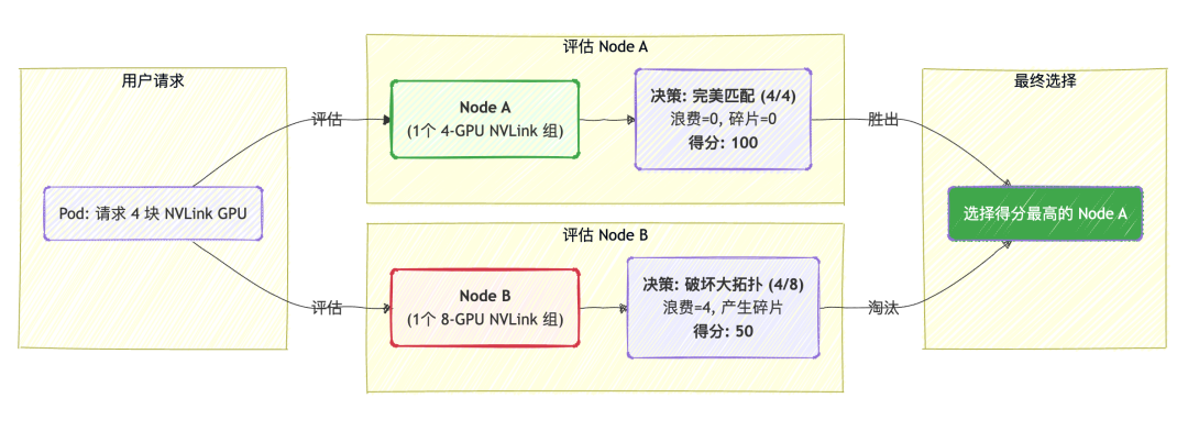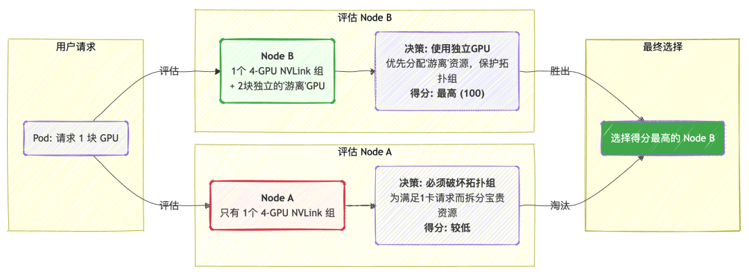 随后,在多个候选节点之间,它通过一个综合了“分配质量”和“拓扑损失”的评分公式进行量化评估,选出不仅对当前任务最好,也对集群未来资源布局最有利的节点。