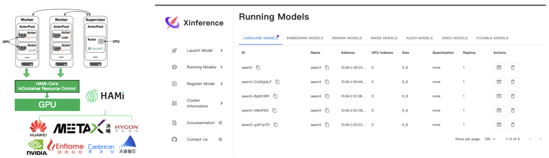 Xinference 是 Xorbits 开源的多模型推理框架,提供 Supervisor/Worker 架构,方便在 Kubernetes 中部署和管理多模型服务。 在企业实践中,Xinference 常遇到 轻量模型独占整卡、资源浪费 以及 多租户场景下缺乏精细化配额与可观测性 的问题。 为此,社区合并了 [PR #6]:在 Helm Chart 中原生支持 HAMi vGPU,通过参数开关即可启用,并透传 HAMi 的 gpucores、gpumem-percentage 等资源变量到 Supervisor/Worker。