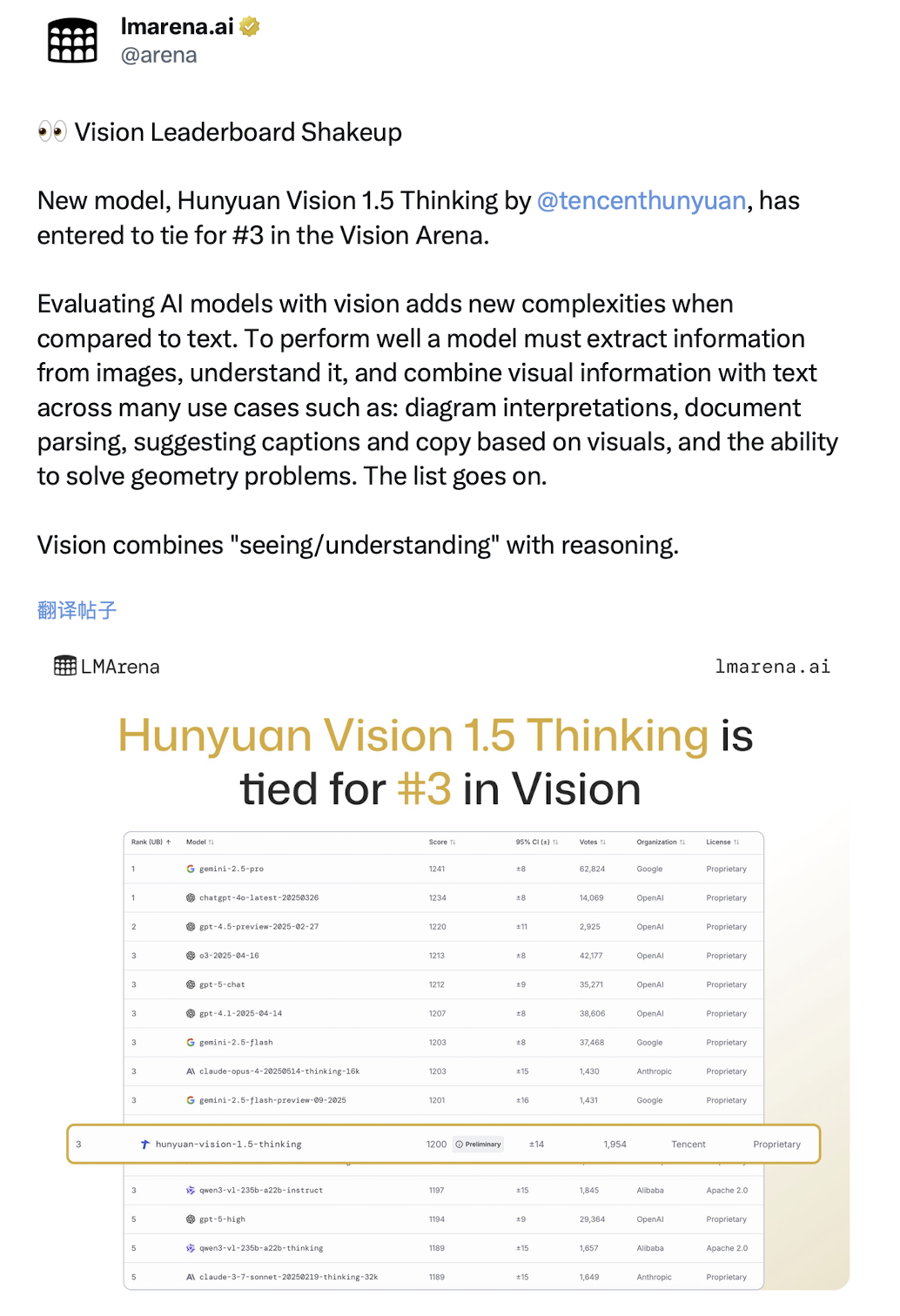 腾讯混元视觉模型跻身全球 Top3,国内排名第 1