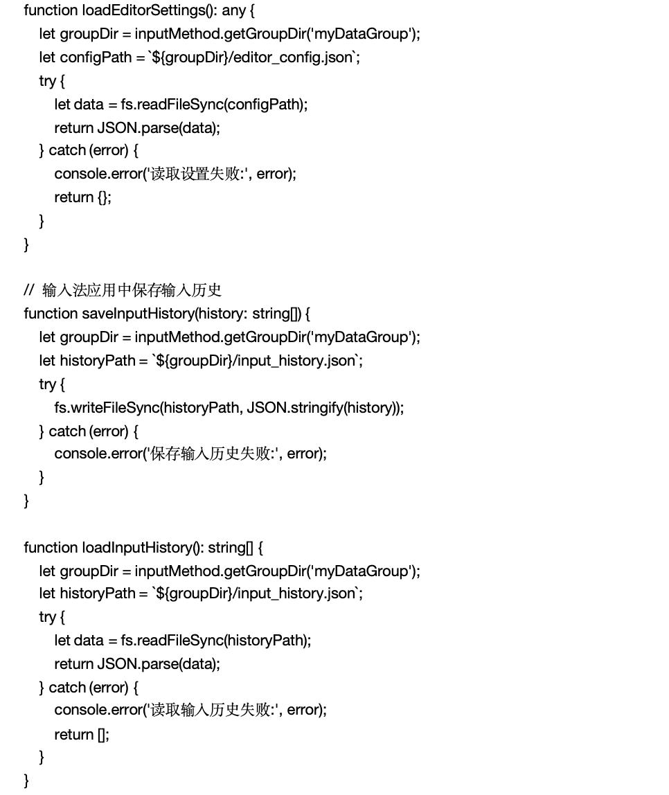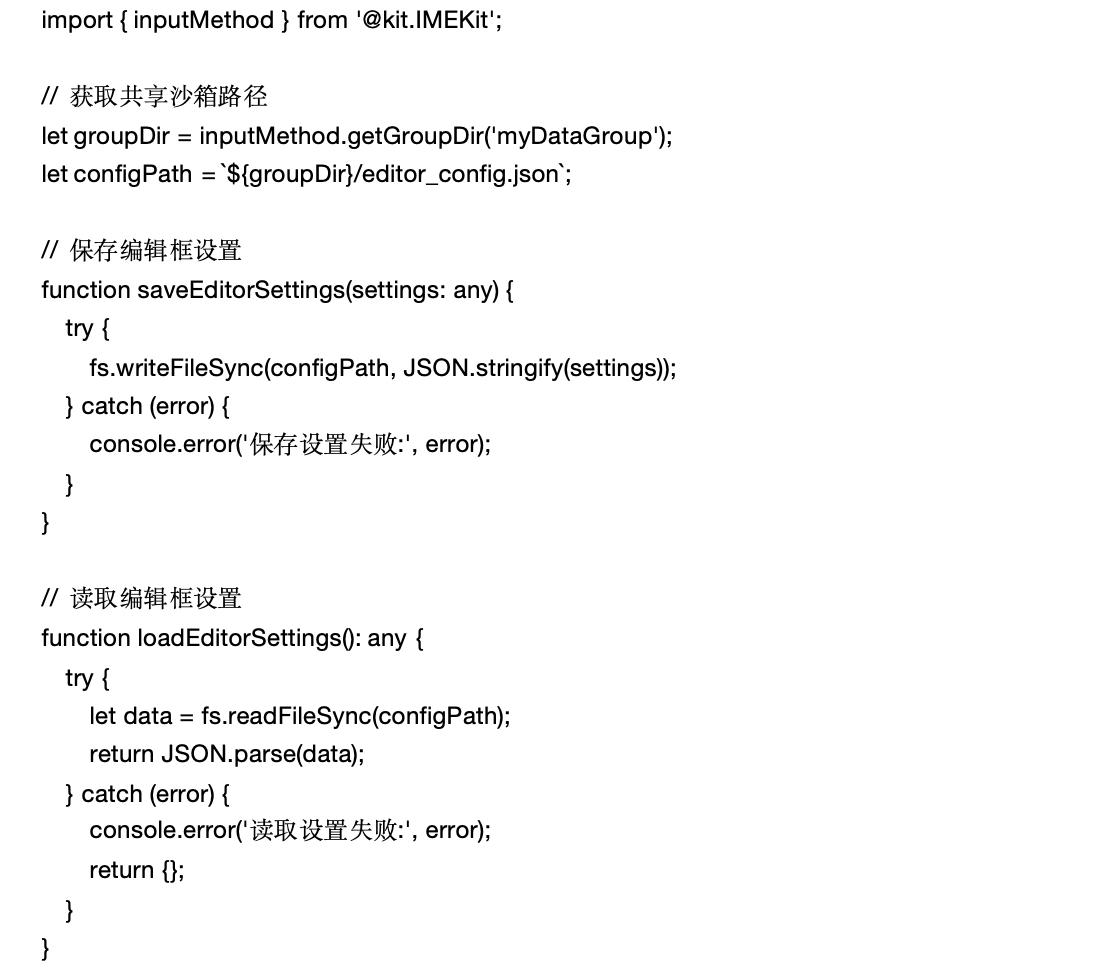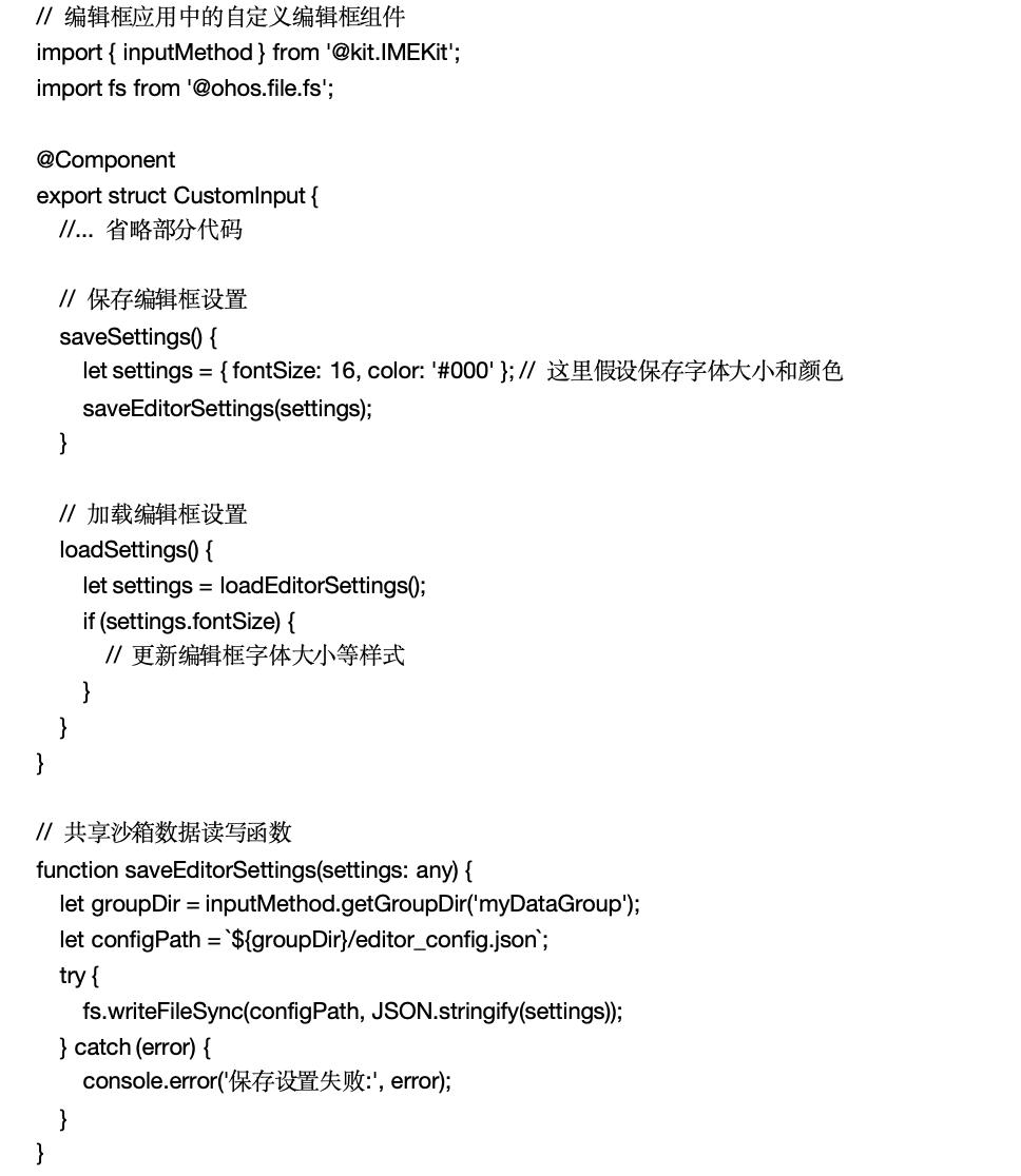 在编辑框应用和输入法应用中,我们可以使用 getGroupDir 方法获取共享沙箱的路径,然后通过文件操作来实现数据的持久化存储和读取。例如,我们可以将编辑框的个性化设置(如字体大小、颜色等)保存为一个配置文件,在应用启动时读取该文件以恢复个性化设置。以下是一个简单的数据持久化示例: