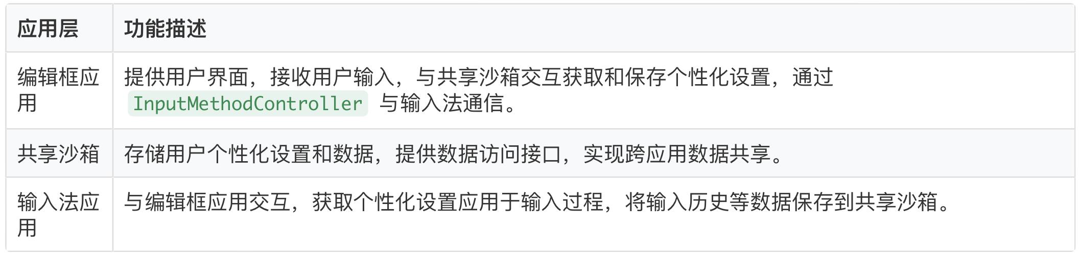 我们设计了一个三层架构,包括编辑框应用层、共享沙箱层和输入法应用层。编辑框应用层负责提供用户界面,接收用户输入,并与共享沙箱进行数据交互以获取和保存个性化设置。共享沙箱层负责管理数据的存储和共享,提供统一的数据访问接口。输入法应用层在用户输入时,与编辑框应用进行通信,获取个性化设置并应用于输入过程,同时将相关数据(如输入历史)保存到共享沙箱中。
