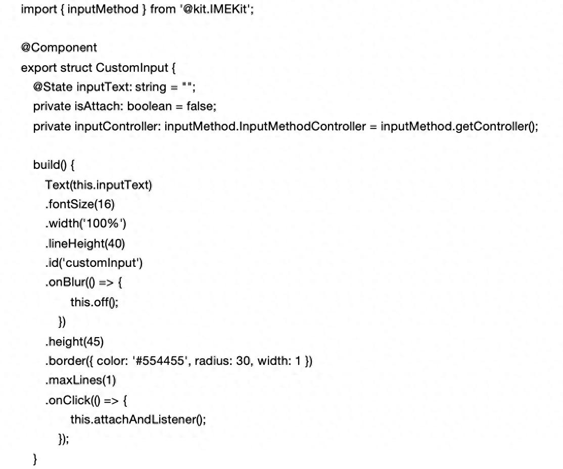 在自定义编辑框的开发中,我们使用 Text 组件作为文本显示组件,并通过状态变量来管理文本内容。同时,为了实现输入和删除操作的监听,我们需要获取 InputMethodController 实例。以下是一个简单的示例代码: