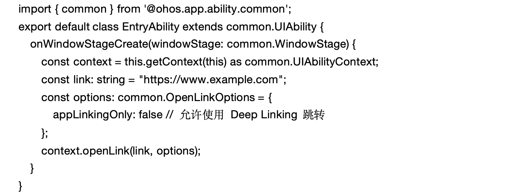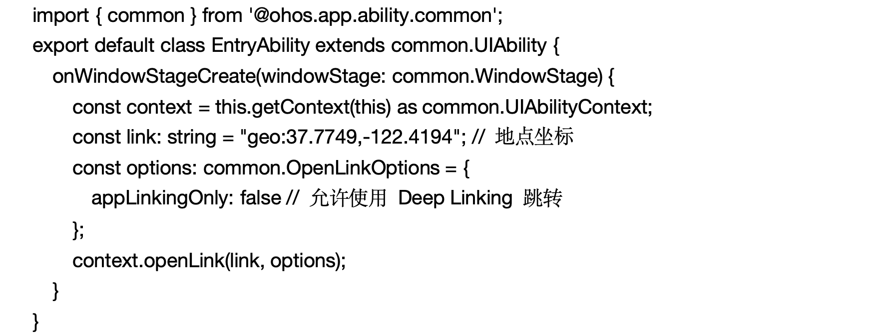 在某些场景下,我们希望应用能够精准控制目标应用,例如打开地图应用查看特定地点,或者打开音乐 App 播放特定歌曲。HarmonyOS 提供了多种方式来实现这种类型的跳转,例如 openLink 接口、startAbility 接口和 Web 组件跳转等。