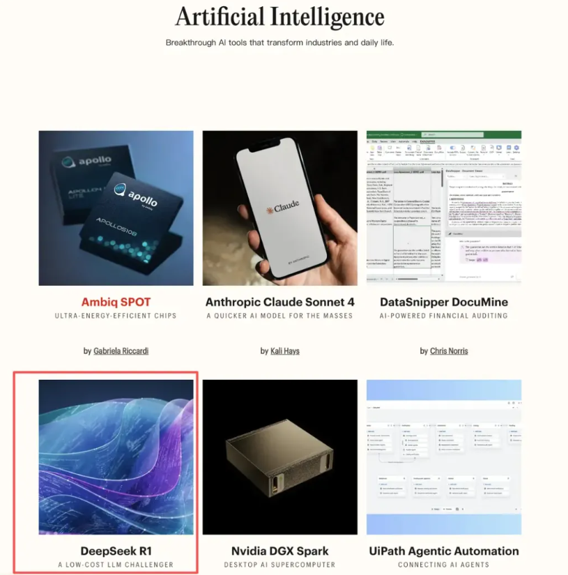 DeepSeek的R1推理大模型则入选了AI发明榜单。《时代》称,今年年初,DeepSeek-R1先进推理模型横空出世,堪称在AI领域打响了“响彻世界的第一枪”。DeepSeek仅用数月时间,就开发出了在行业标准测试中媲美OpenAI当时最先进产品的模型,而且训练成本仅600万美元。该模型所需算力更是仅为美国竞争对手的零头,且至今仍免费开放使用。