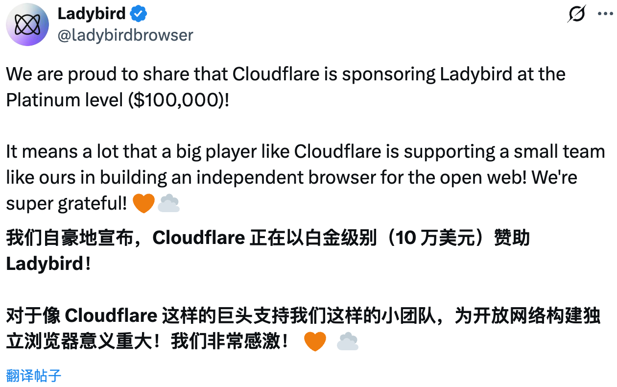 Cloudflare 宣布赞助开源浏览器引擎 Ladybird 10 万美元,以支持开放网络生态的发展。