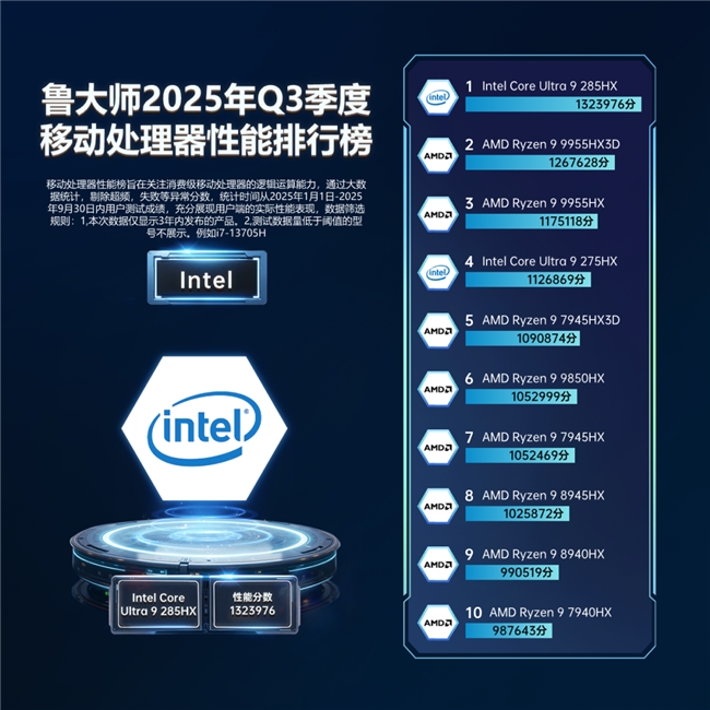 在笔记本移动平台,酷睿Ultra 9 285HX成绩逐步稳定提高已经来到了132万分。这个成绩相比桌面版的Intel Core Ultra 9 285K的134万分相差已经不多。桌面版本的性能优势正在被逐渐蚕食。 AMD Ryzen 9 9955HX3D依旧排在第二,而主流消费级产品端,AMD并没有特别出彩的产品,基本被intel 的两代i7垄断。
