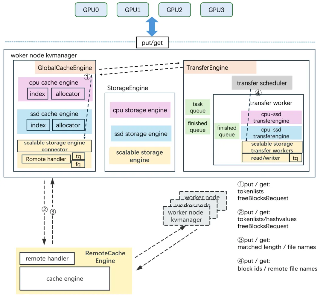 当新请求到达时,GlobalCacheEngine 将比对各级存储中已缓存的 token 数量,智能决策是否从 SSD 或远端扩展存储拉取数据,并通过内存中转至 GPU,实现最优访问路径。