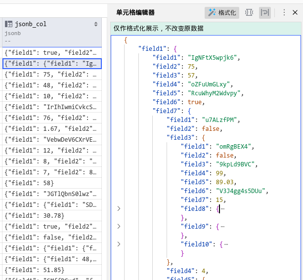 查看数据库时,可在单元格编辑器中查看 JSON 类型数据,格式化后的可视化效果更佳。