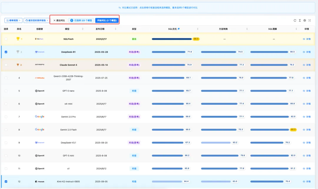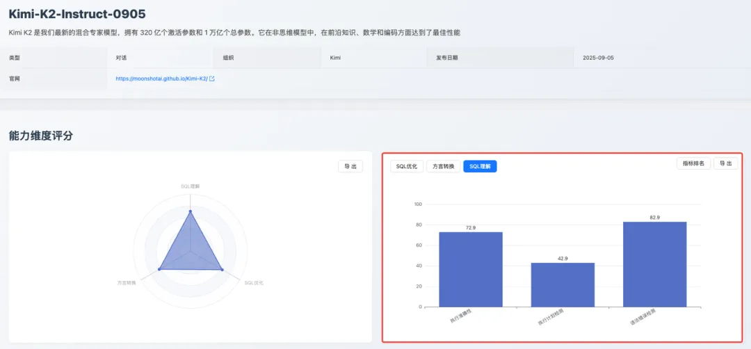 2025 年 9 月,SCALE 评测基准持续聚焦 AI 在 SQL 领域的应用前沿。本月,榜单新增了 Moonshot AI(月之暗面) 发布的最新模型 ------ Kimi-K2-Instruct-0905,还在平台功能上进行了升级,旨在为开发者、研究者和企业决策者提供更精细、更具洞察力的技术参考。