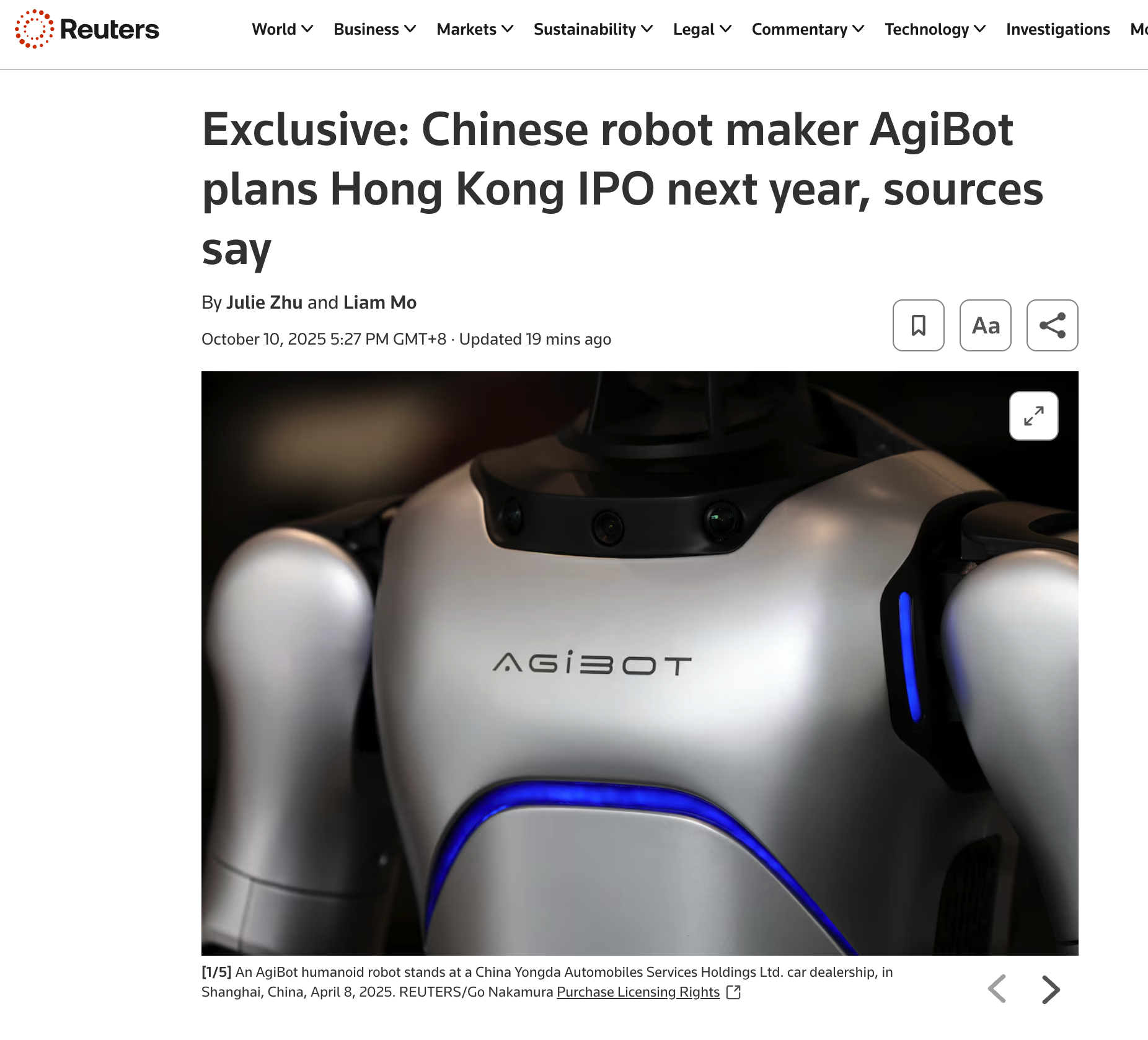根据路透社的独家报道,智元机器人正筹备在 2026 年于香港进行首次公开募股(IPO),目标估值高达 400–500 亿港元(约 51–64 亿美元)。
