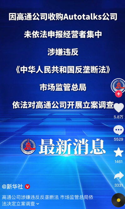 中国国家市场监管总局10日通报,因高通公司收购Autotalks公司未依法申报经营者集中,涉嫌违反《中华人民共和国反垄断法》,国家市场监管总局依法对高通公司开展立案调查。