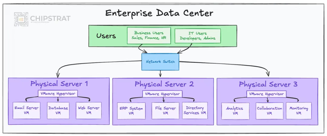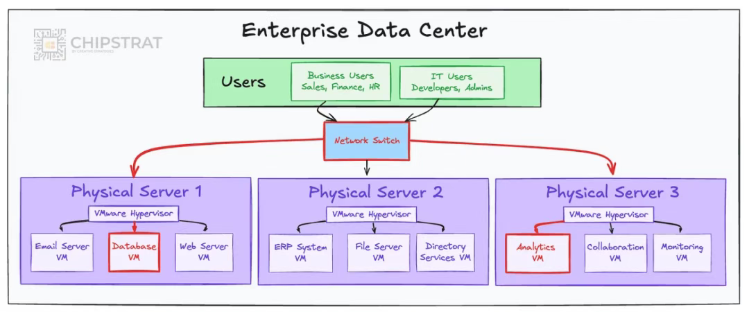 企业网络需同时运行多种业务应用:如邮件服务器、数据库、ERP、CRM、分析工具等。这些工作负载通常运行在搭载多个虚拟机的高性能多核服务器上,每个虚拟机隔离执行独立任务。