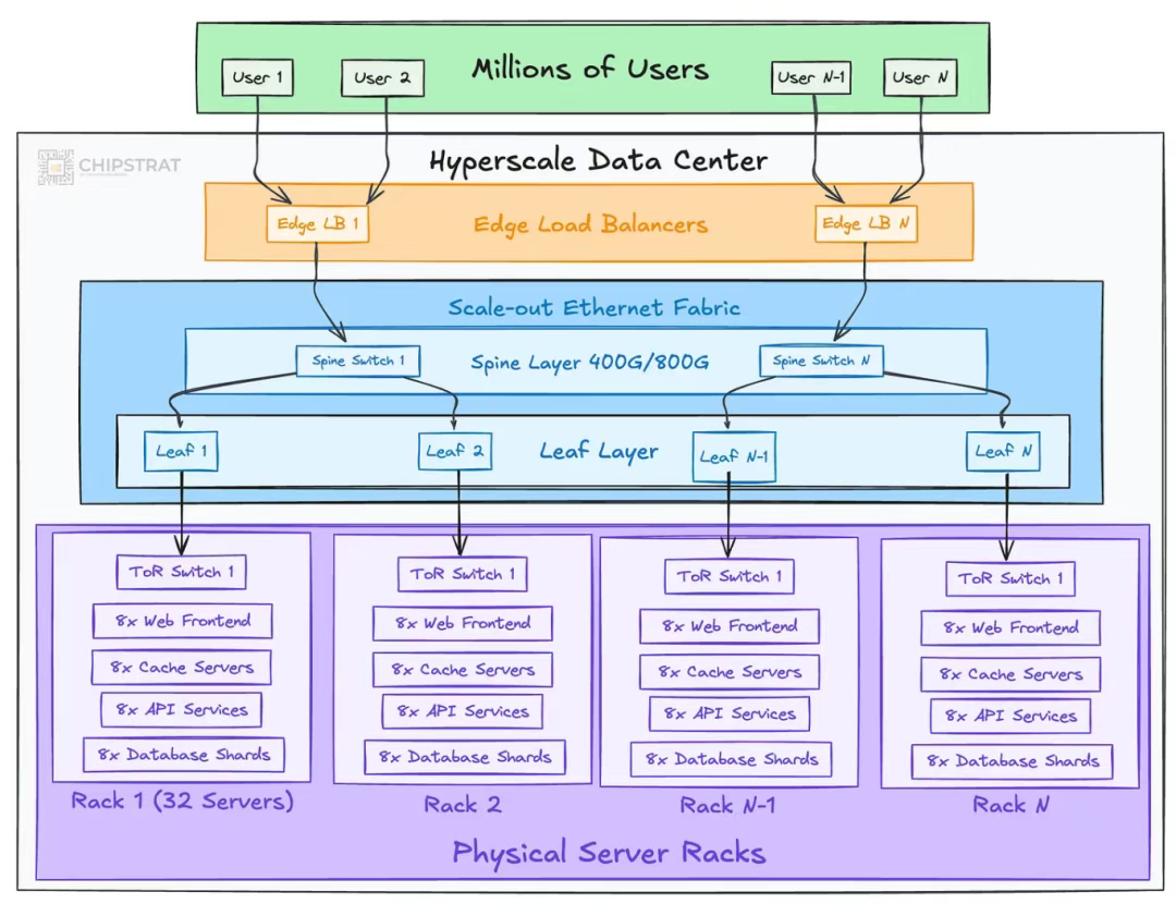 超大规模数据中心专为将单一服务扩展至数百万乃至数十亿用户而构建,例如 Gmail、YouTube、Netflix 或亚马逊电商。成千上万台服务器各司其职,共同构成一个庞大的分布式系统。