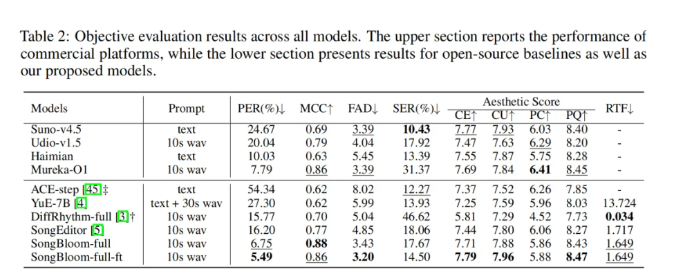 腾讯方面表示,在客观指标层面,SongBloom 的美学评分不仅远超开源基线模型,更与顶尖商用模型持平甚至实现超越;同时,模型具备极强的歌词 follow 能力,大幅减少 “幻觉生成”(生成内容与歌词不匹配)现象,显著降低了音素错误率(PER),让歌词准确性达到行业新高度。