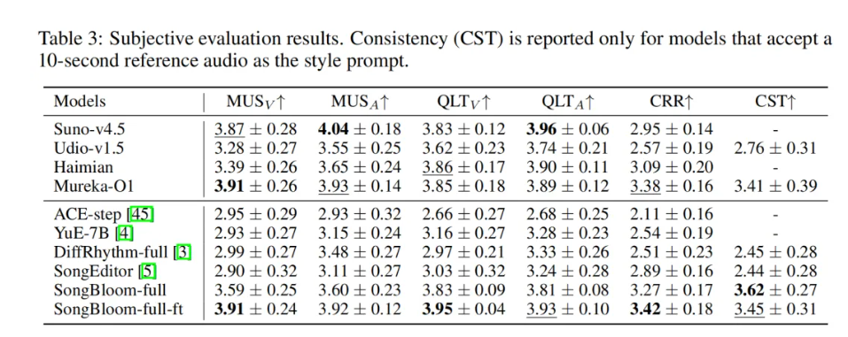 在主观听感评测中,SongBloom 的表现同样惊艳。得益于 VAE latent 保留的丰富声学细节,其人声音质细腻度直接超越目前顶尖闭源商业模型 Suno-v4.5;而在音乐性上,也达到了媲美甚至超越部分闭源商业模型的水平,让 “AI 生成音乐” 更贴近专业创作质感。