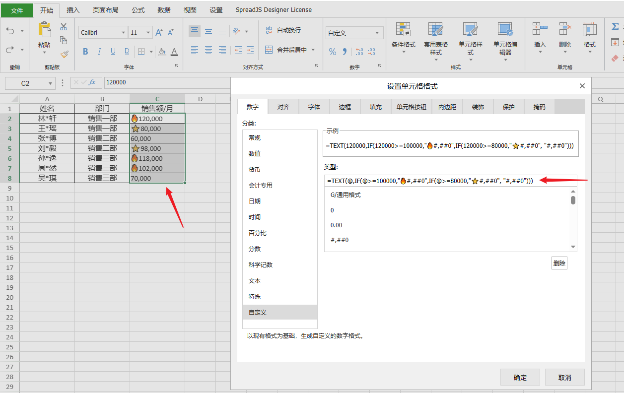 需求1:当月销售额>=100000元显示火苗"🔥",月销售额>=80000显示星星"⭐",月销售额低于80000元时不显示. 针对此需求,可以结合IF函数判断条件显示目标格式效果,自定义格式具体为: