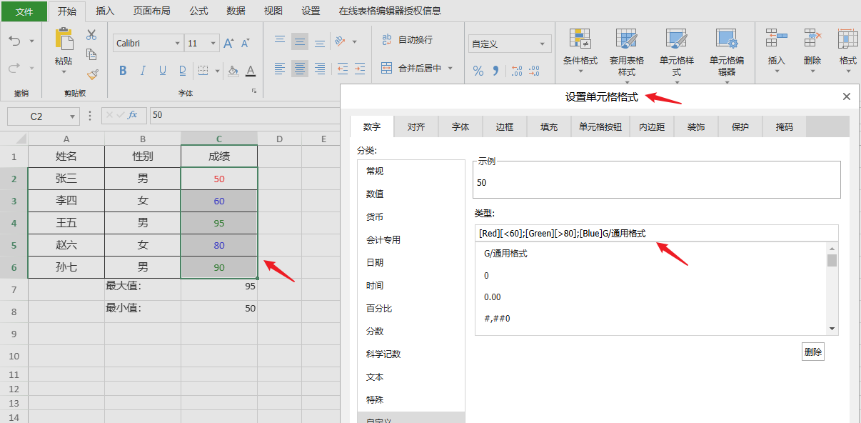 选择"成绩"列单元格,打开单元格格式弹窗,在自定义中输入:[Red] [<60];[Green] [>80];[Blue]G/通用格式。 第一个[] 为显示文本颜色,第一个[] 为判断条件,同样也用英文分号分隔开。