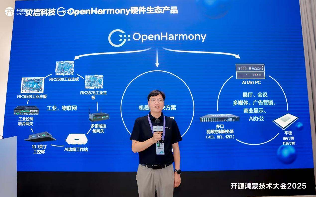 厦门贝启科技有限公司总经理刘建文在《贝启科技深耕开源鸿蒙硬件产品助力统一生态建设》议题中,详细介绍了贝启科技基于瑞芯微方案的开源鸿蒙应用成果。贝启科技基于RK3566、RK3568、RK3588、RK3576、CP8180等芯片适配开源鸿蒙系统,推出多领域硬件生态产品,如RK3588工业主板、工控屏、工业网关、AI边缘工作站、具身机器人、AI Mini PC等,覆盖工业、物联网、机器人解决方案、商显、AI办公等多个场景,系统适配性、稳定性和性能优化均达到高标准,并支持多版本开源鸿蒙系统。此外,还提供基于开源鸿蒙的Docker部署、QT应用开发、Modbus通信、组态软件、多种显示技术、RKNPU多核推理等软件支持,助力开源鸿蒙在工业自动化、物联网等领域的应用,推动统一生态建设。