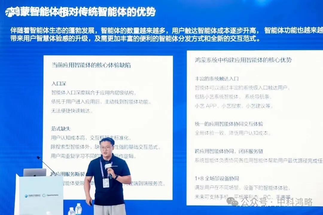 北京中科鸿略科技有限公司北向技术专家董海峰做《重构连接:开源鸿蒙统一生态下的智慧协同新范式》议题分享,介绍了开源鸿蒙智能体相对传统智能体的优势。当前主流操作系统的生态范式均以APP为中心构建,未来几年的开源鸿蒙生态系统将以面向场景的智能服务形态为终极演进目标,呈现出以AI智能体为中心、多种服务形态并存的新范式,包括APP、元服务等已存在的形态以及以AI智能体为载体的智能服务新形态。