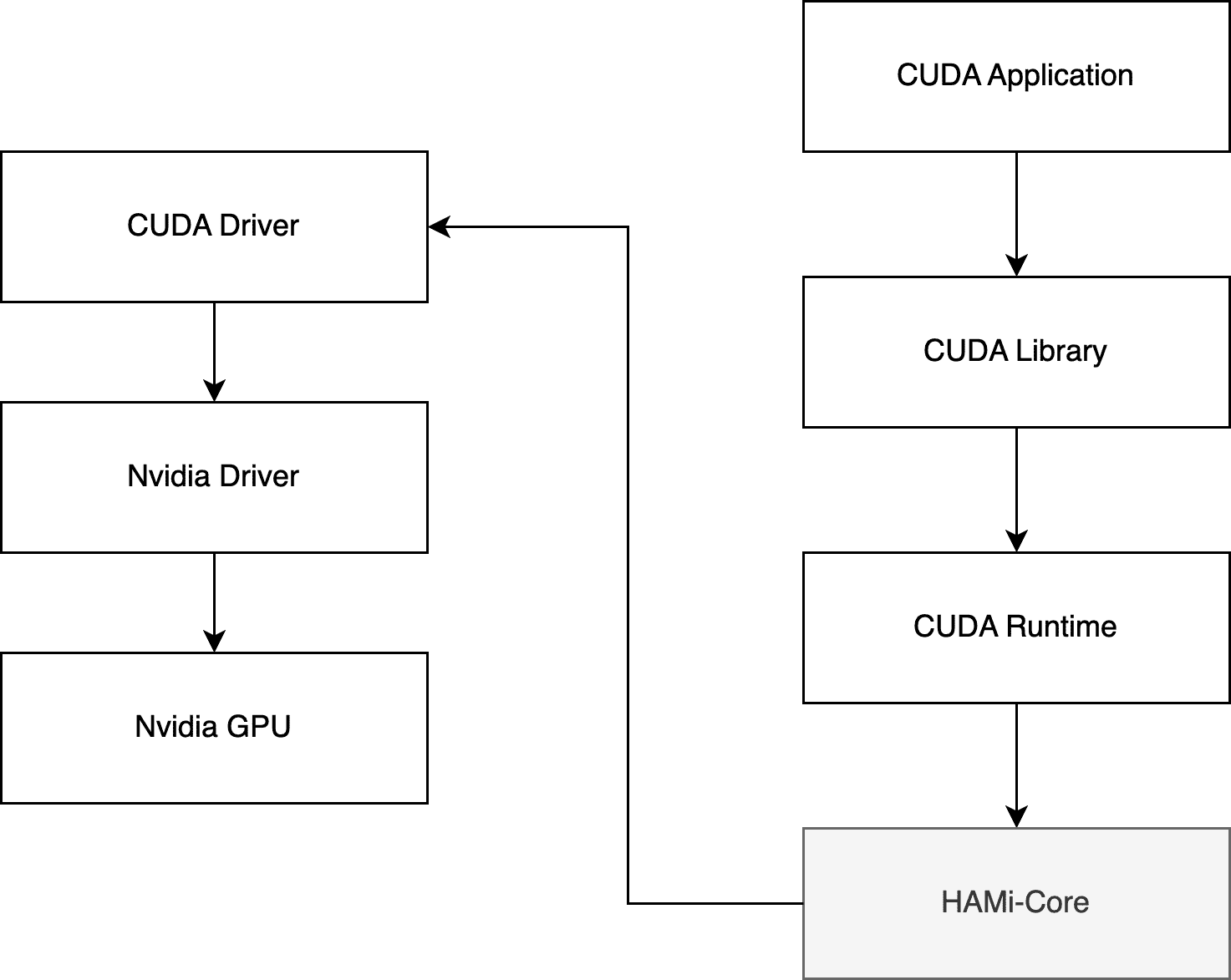 HAMi-core 本质上是一个实现了 CUDA API Hook(钩子)的动态链接库 (libvgpu.so)。它的工作原理非常巧妙,也十分经典: