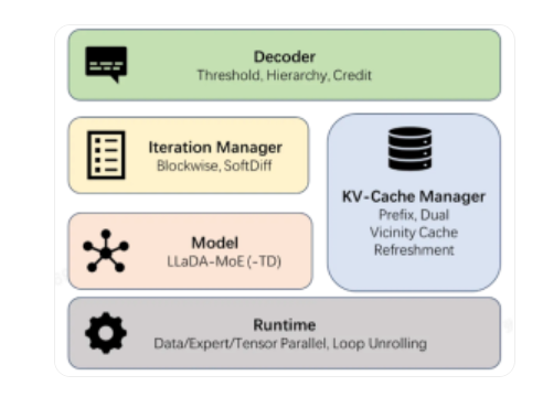 dInfer包含四大核心模块:模型接入(Model)、KV缓存管理器(KV-Cache Manager),扩散迭代管理器(Iteration Manager),和解码策略(Decoder)。这种可插拔的架构,允许开发者像搭乐高一样,进一步组合和探索不同模块的优化策略,并在统一的平台上进行标准化评测 。更重要的是,dInfer针对上述三大挑战,在每个模块中都集成了针对性的解决方案。