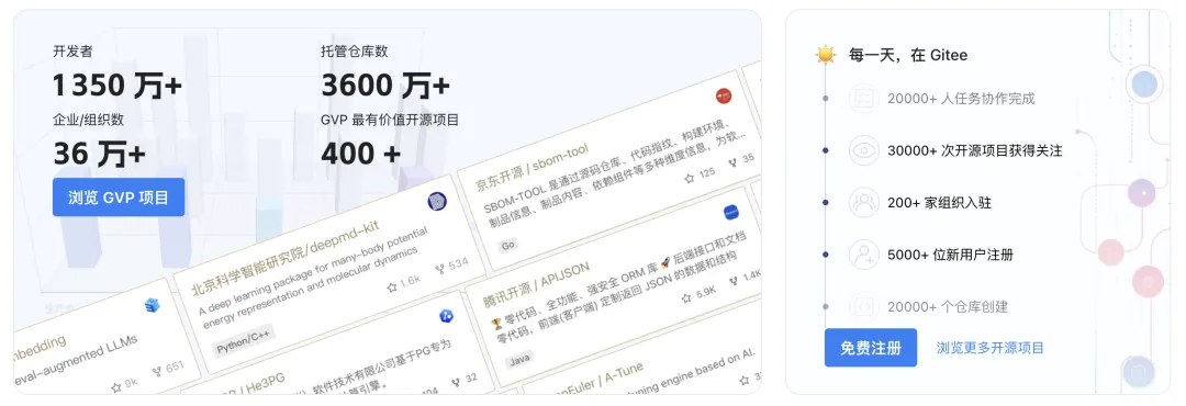 Gitee 一直在推动国内开源基础设施建设,十余年来为超过 1350 万名开发者提供服务,托管仓库数超过 3600 万,覆盖操作系统、数据库、中间件、安全工具、AI 模型等多个关键领域。