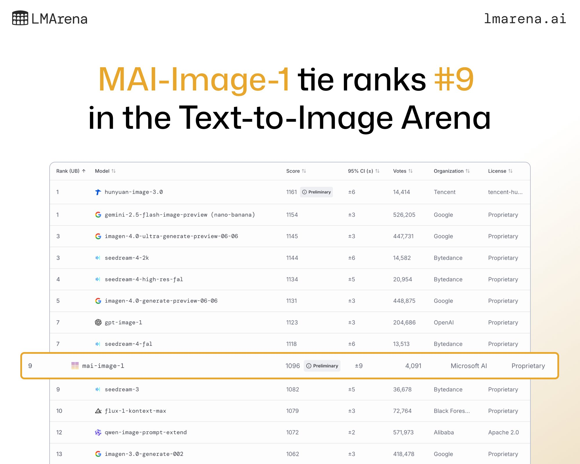 微软正式推出其首个完全自主研发的图像生成模型 MAI-Image-1,并在知名 AI 模型评测平台 LMArena 上首次亮相就进入了文本到图像模型的 Top 10 排行(https://lmarena.ai/leaderboard/text-to-image)。