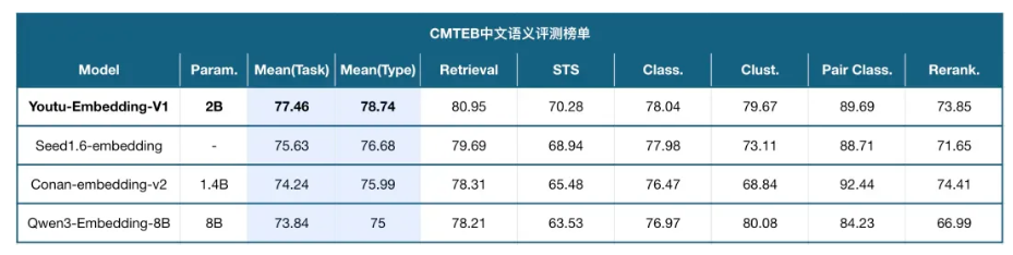 - 在中文文本嵌入评测基准 CMTEB 上,Youtu-Embedding 以 77.46 的高分荣登榜首(截至2025年09月)