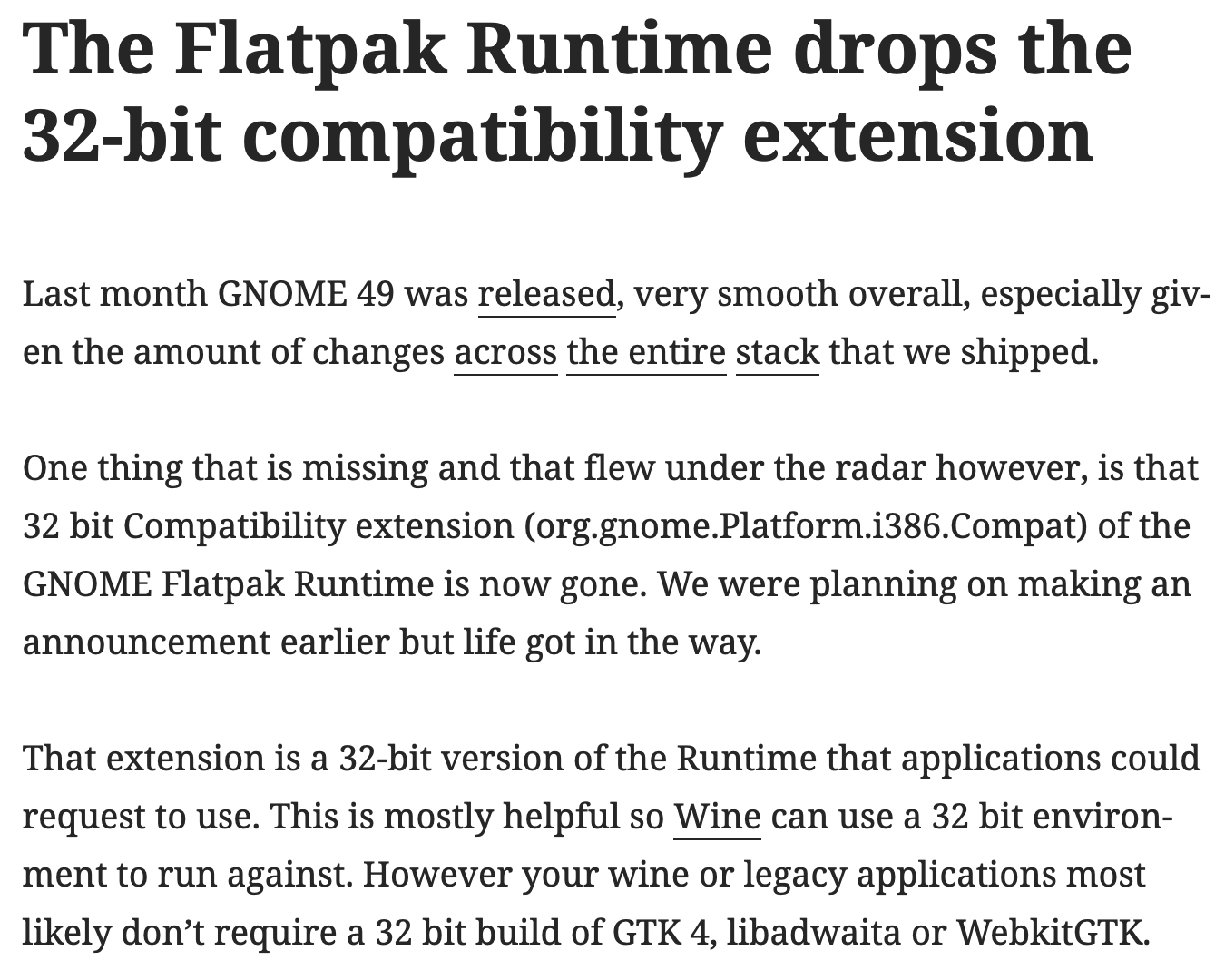 GNOME Flatpak 运行时不再兼容 32 位扩展