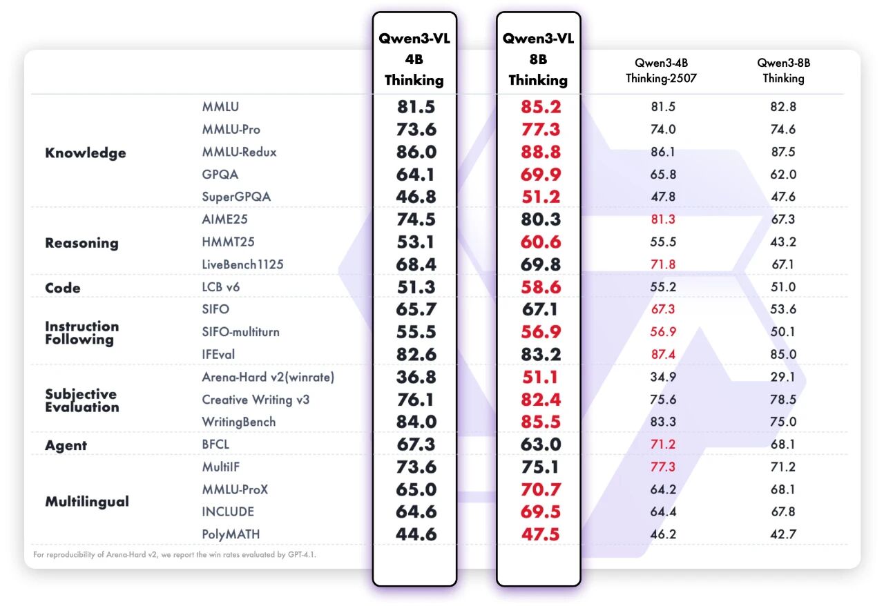 本次发布包含了 4B 和 8B 两种参数规模,两个尺寸均提供 Instruct 与 Thinking 版本。