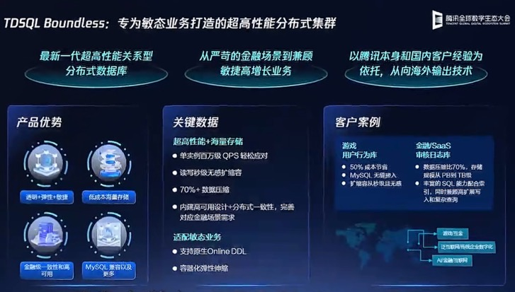 - TDSQL-B:本次大会重磅发布的专为敏态业务打造的超高性能分布式集群,特别适用于金融场景和高增长业务。TDSQL-B 聚焦三大核心能力。首先是金融级高可靠,通过多副本容灾和快速故障恢复,实现数据零丢失、服务零中断。其次是性能突破,具备百万级 QPS 处理能力与海量存储,同时拥有无限的 TP 扩展性与轻量 AP 能力,能够轻松应对电商大促订单峰值、直播弹幕互动等高并发事务场景。TDSQL-B 在语法兼容性方面 100% 兼容 MySQL,支持分钟级弹性扩缩容,既“好用如单机”,又能抗流量洪峰。