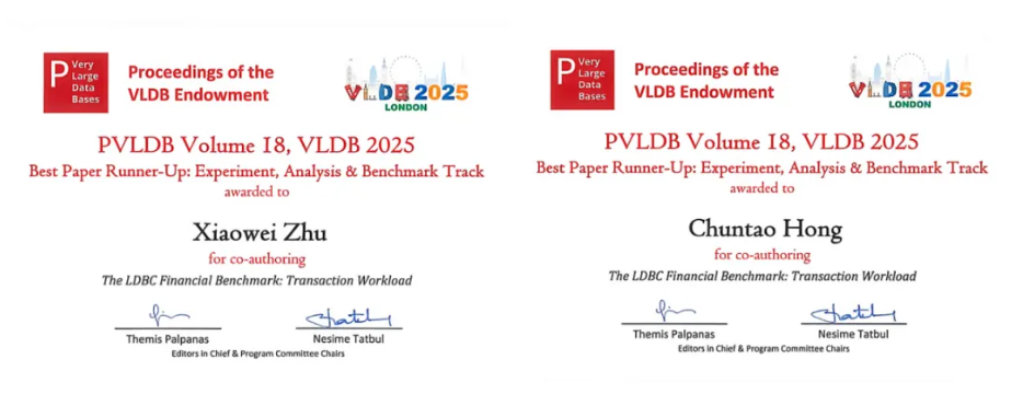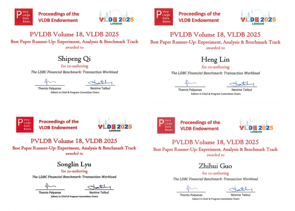 蚂蚁集团发起共建并主导设计的图数据库基准研究论文《The LDBC Financial Benchmark: Transaction Workload》荣获大会实验、分析与基准测试“最佳论文亚军奖”。
