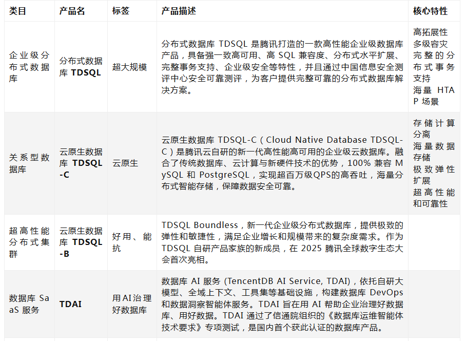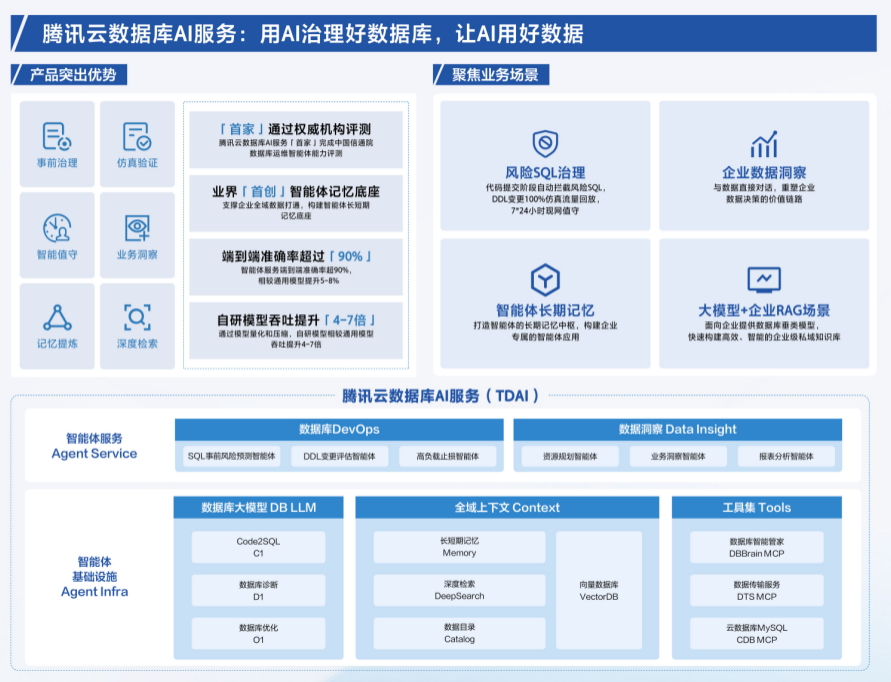- 腾讯云正式推出数据库AI服务(TencentDB AI Service,简称TDAI)旨在用AI帮助企业治理好数据库、用好数据。TDAI依托自研数据库大模型、全域上下文、工具集这三大智能体基础设施,构建了数据库DevOps与数据洞察两大核心场景的智能体服务,将智能体能力引入数据库治理。
