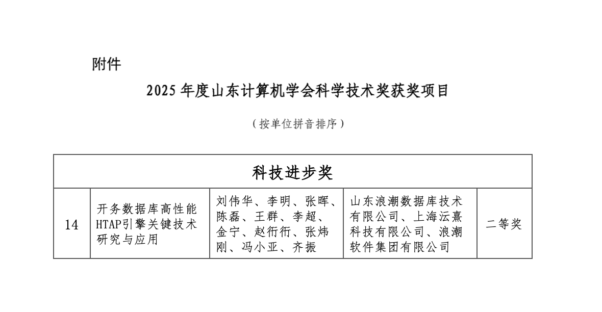 浪潮KaiwuDB荣获2025年度“山东计算机学会科技进步二等奖”