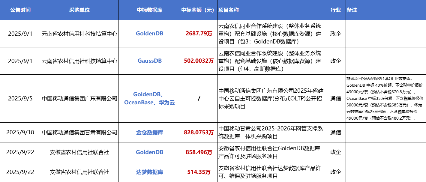 2025年9月诞生了6个500万以上数据库大单。比如云南农信采购GoldenDB、GaussDB和达梦数据库,安徽农信采购GoldenDB和达梦数据库,电科金仓中标甘肃移动数据库一体机项目,广东移动采购GoldenDB、OceanBase和华为云数据库。