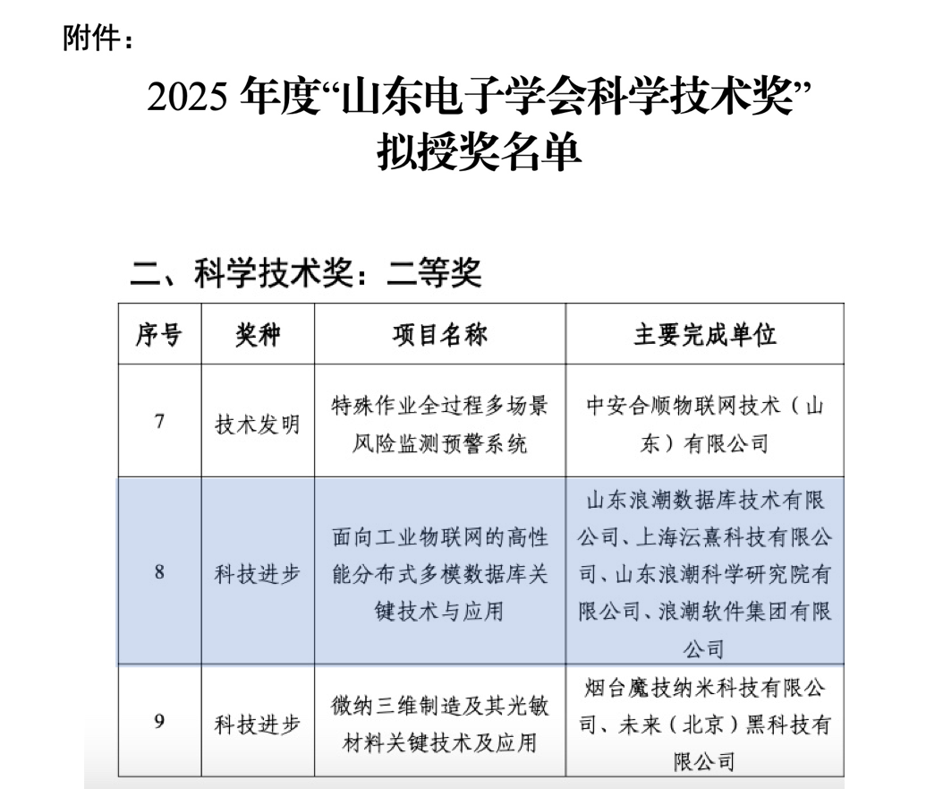 9月1日,山东电子学会公布2025年度“山东电子学会科学技术奖”评审结果。浪潮数据库(KaiwuDB)、浪潮科学院、浪潮软件集团联合项目“面向工业物联网的高性能分布式多模数据库关键技术与应用”荣获科技进步二等奖。该项目成果以分布式多模数据库系统KaiwuDB 为依托,已在山东、上海等多省市落地,成功应用于新能源、智能制造等领域,为企业数字化转型提供核心数据支撑。