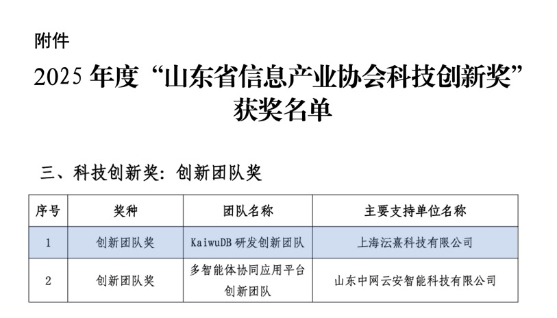 9月1日,山东省信息产业协会公布 2025 年度“山东省信息产业协会科技创新奖”获奖名单,浪潮KaiwuDB 研发团队荣获“创新团队奖”。2025年,KaiwuDB 研发团队在多模、时序数据处理、AI 预测分析、云边端数据协同及异构计算加速等 5 大核心技术上实现突破,新申请相关专利 90 余篇。