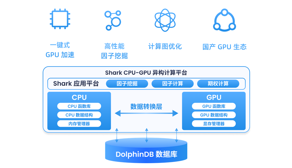 - Shark是DolphinDB与海光信息合作开发的CPU/GPU异构计算平台,其核心组件Shark Graph并行计算引擎显著提升了性能,使因子挖掘速度提高了10倍以上,并且能够通过简单的“@GPU”标签实现DolphinDB脚本在GPU上的一键加速,性能提升可达10至20倍,同时减少CPU和内存占用。目前,Shark平台已支持海光DCU处理器,并计划继续优化国产处理器的性能和易用性,以提供更强大的计算能力。