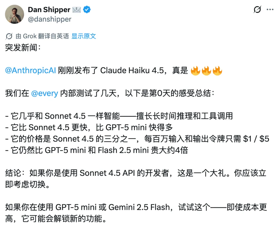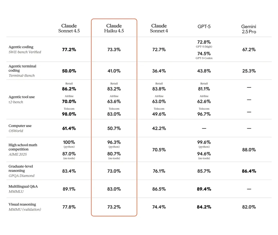 对比来看,GPT-5 mini 约为每百万输入 0.25 美元、输出 2.5 美元,Google 的 Gemini 2.5 Flash 价格差不多。也就是说,Haiku 4.5 的价格大约是 GPT-5 mini 或 Flash 的 4 倍。 不过跟 Sonnet 4.5 比,它便宜了约三倍,性能却几乎没差,这对开发者来说算是降本增效了。